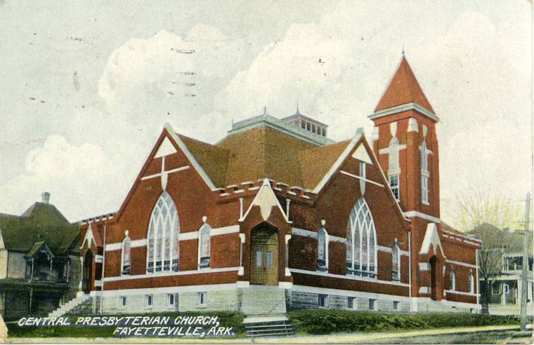 DescriptionColor postcard of the "Central Presbyterian Church, Fayetteville, ARK" Red brick church.