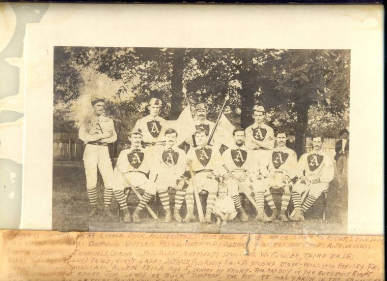 Description in ink on paper attached - Left to Right: "Fred Seibard, pitcher; Ormand Butler Feild, outfield; Albert Wassell, outfield; A.Jennings - Standing. Sitting: Chester Jennings, catcher; H.G. Allis, outfield; Sterling W. Tucker, third base; Silas Talbot (Tolly) Feild, first base; Arthur Flornoy Feild, 2nd base; William Presley Feild, shortstop; and William Allen Feild, age 5, seated in front. The batboy in the extreme right background is either Jim Lewis or Buck Simpson. The picture was taken in the front yard of the residence of Silas Flournoy Feild at 215 East 9th St.