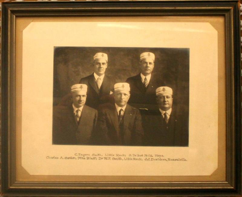 DescriptionBlack & white photo of five men crowned as 33 degree Masons. In wood frame, painted blue/gray. Men are identified as Eugene Smith, Talbot Feild, Charles Gordon, W.F. Smith, & J.J. Davidson.Status