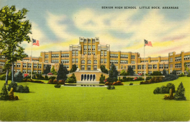 DescriptionA postcard depicting the Senior High School, now known as Central High School, in Little Rock, Arkansas. The postcard features a color image of the building, which is tan brick and concrete, with a green lawn and two flagpoles. Text in the upper right corner states "Senior High School" and "Little Rock, Arkansas".