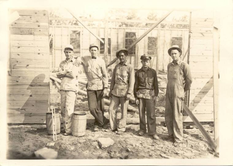 DescriptionBlack and white photographic print of 5 men standing in front of partially finished frame structure, part of construction crew. 2 men are wearing carpenter's aprons "Padgett Lumber Co." Man with hat on in middle wears apron with "Wood Freeman Lumber co." The National Youth Administration is responsible for construction projects during the 1930s.
