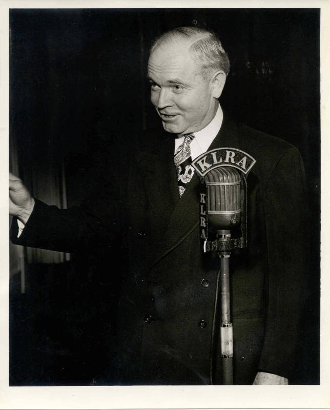 DescriptionBlack and white photograph from Ben Laney's campaign--Laney in a suit at a KLRE radio station microphone.Status