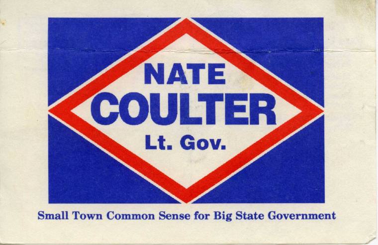 DescriptionNate Coulter campaign postcard. Blue print inside red and white diamond: "Nate/Coulter/Lt. Gov." The back contains his beliefs and concerns, which include a better start for children, safer communities, and more efficient government.Status