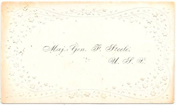 Printed in script font is "Maj. Gen. F. Steele, U.S.V." Around the edge of the card is an debossed floral patter.
