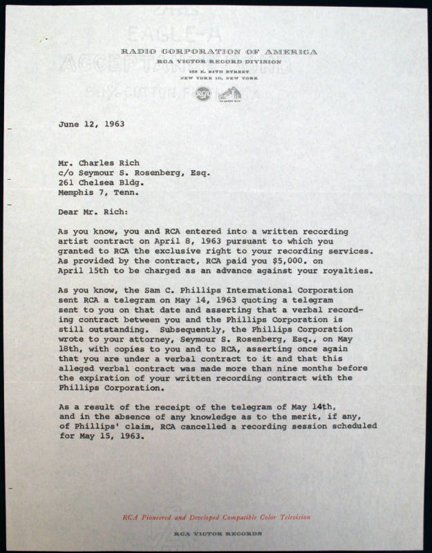 DescriptionRCA letter referring their signed contract dated April 8, 1963, with Charlie Rich. Sam Phillips alleges that he has a verbal contract with Charlie Rich. RCA is urging Charlie Rich to resolve contract issues with Sam Phillips. Otherwise Charlie Rich would be in breach of contract with RCA and have to return the $5000 advance payment. a-b = 2 pages.