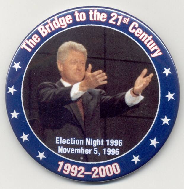 DescriptionOne of eight buttons from the 11/5/1996 election night of President Bill Clinton manufactured by United Cerebral Palsy. This button shows President Clinton stretching out his arms. The blue rim contains "The Bridge to 21st Century 1992-2000"