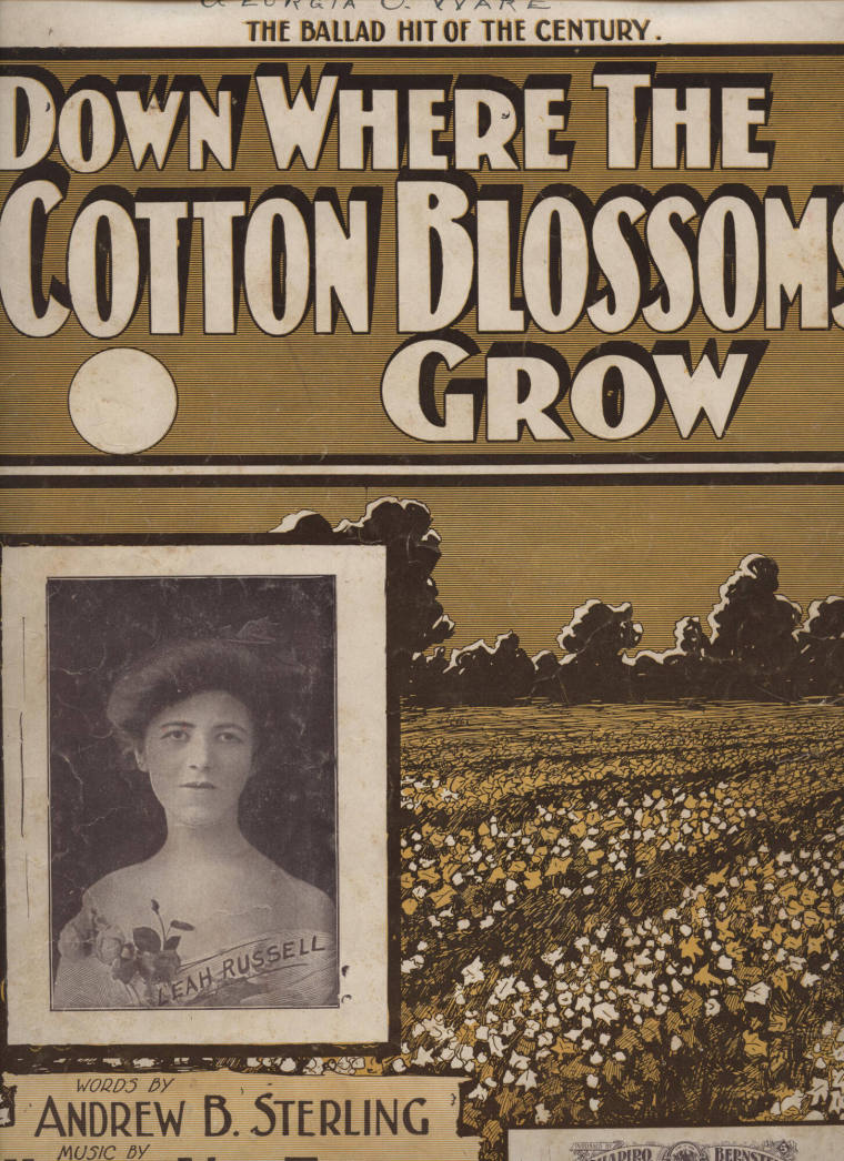 DescriptionSheet Music for "Where the Cotton Blossoms Grow" written by A. B. Sterling and H. Vontilzer. Gold, brown, and white cover with a cotton field and photo of leah Russell. At the top in ink "Georgia O. Ware". There is a stamp at the bottom that reads "Sale by H. M. Wood, Paragould, Ark." Five pages total with ads fotr other songs on the inside of the back cover.