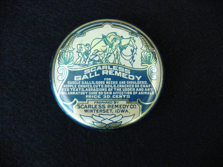 DescriptionRound medicine tin. Blue and white. Scarless Gall Remedy. Prepared by the Scarless Remedy Co. of Winterset, Iowa.Status