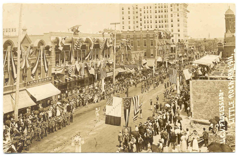 Postcard with photograph depicting a parade street scene in downtown Little Rock. The image is in black and white, taken from a roof top looking down upon a crowded dirt street. "U.C.V. PROCESSION/LITTLE-ROCK-1911," is written vertically, in white, on the original image. The buildings are adorned with banners and American and Confederate flags, with onlookers congregated below along the sides of the street. The reverse side of the postcard is blank, with a few sparse markings likely made by a previous collector.