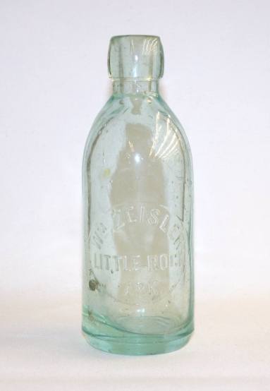 The bottle is simple in form - cylindrical in shape with a long thick neck that widens at the mouth. The bottle is dark green, increasingly opaque towards the base. The bottom of the bottle has a conical cavity with no makers marks.